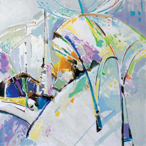 Плоскость холста чётко структурируется за счёт использования точно расположенных живых линий, локальных пятен, декоративных штрихов и точек. В некоторых местах холст оставлен нетронутым, и его зернистая фактура тоже работает на создание композиции и образа.